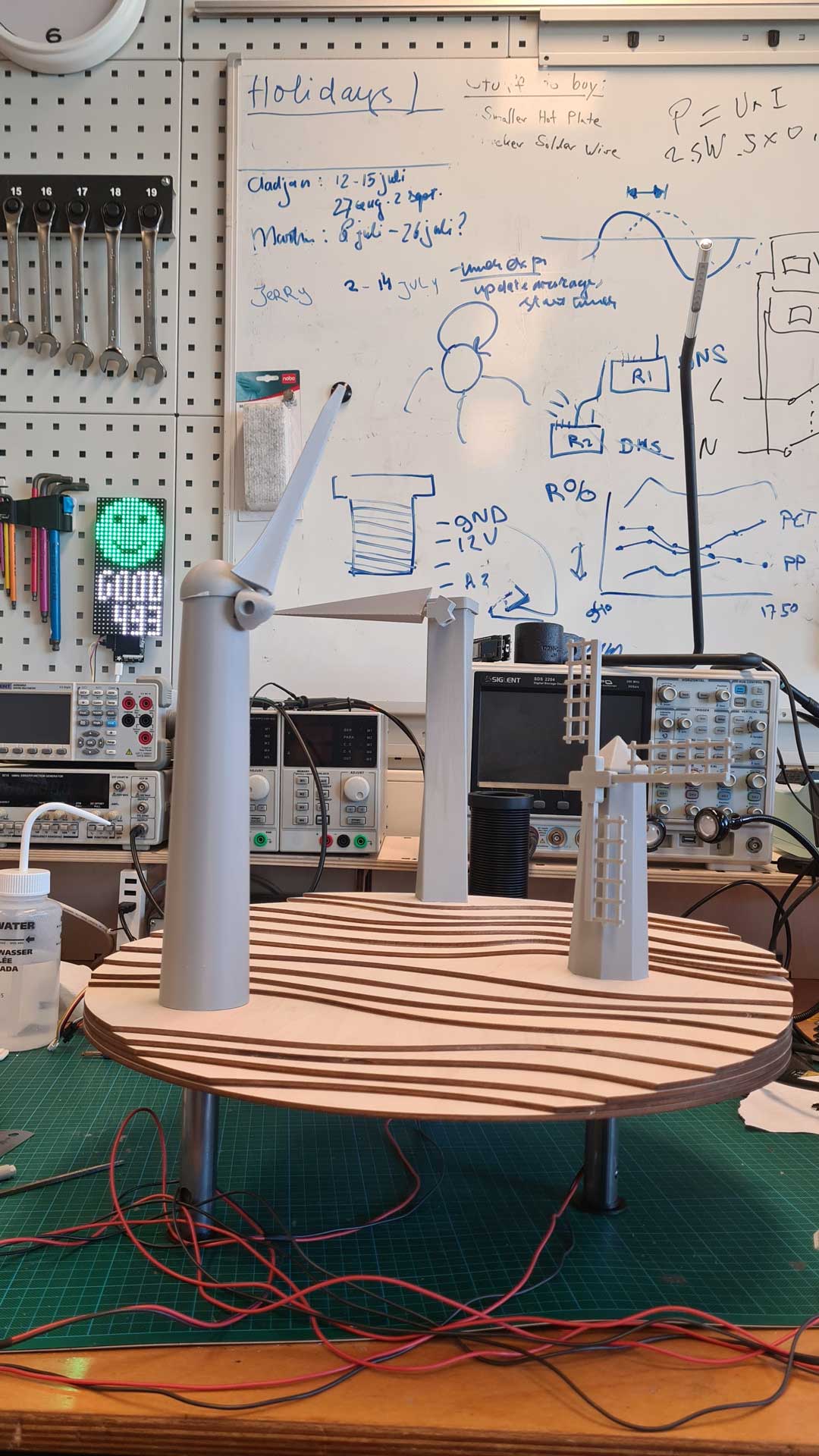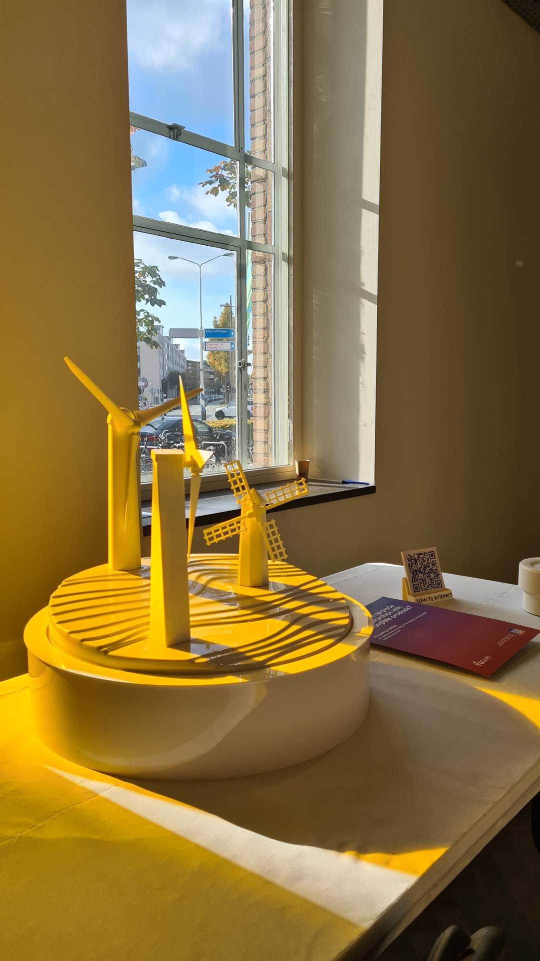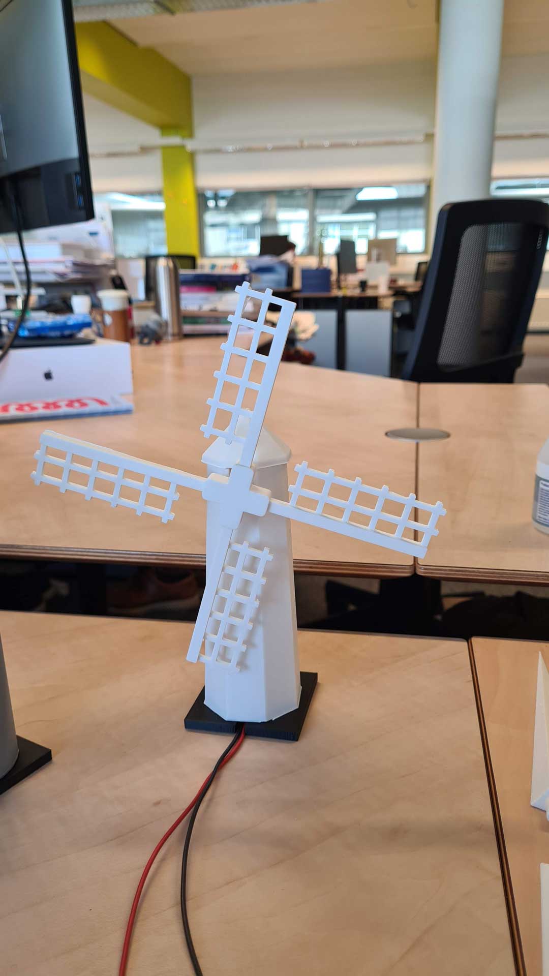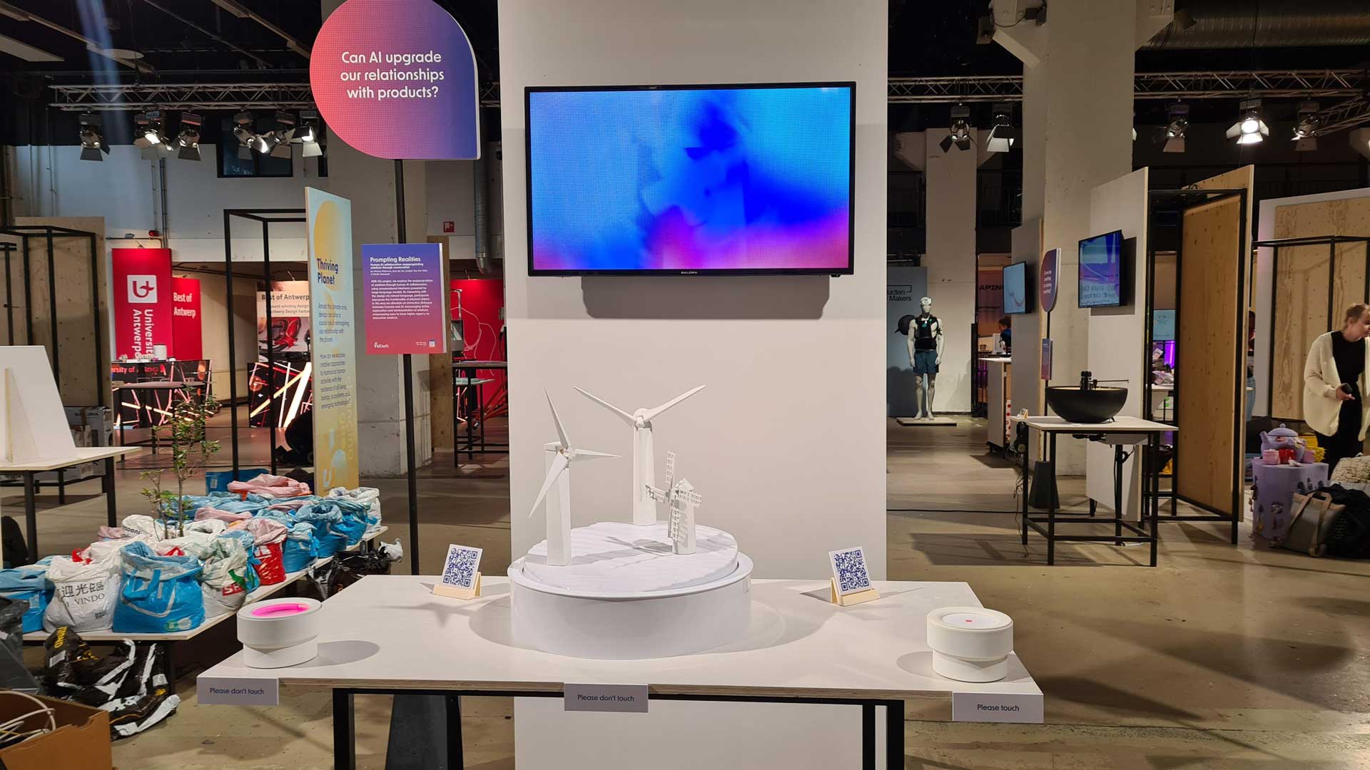 The Windmill Ecosystem Prototype operationalizes the concept of Prompting Realities by demonstrating how natural language interaction can orchestrate a network of physical and virtual artifacts. The system connects a large language model (LLM) interface to a set of three tangible windmills—each representing a distinct behavioral agent—through structured MQTT communication. When users issue prompts, the assistant interprets them into machine-readable commands defining direction, speed, and timing parameters, which are then transmitted to control each motorized windmill in real time. This loop—prompt → structured response → actuation—embodies how linguistic input can fluidly modulate physical expression.