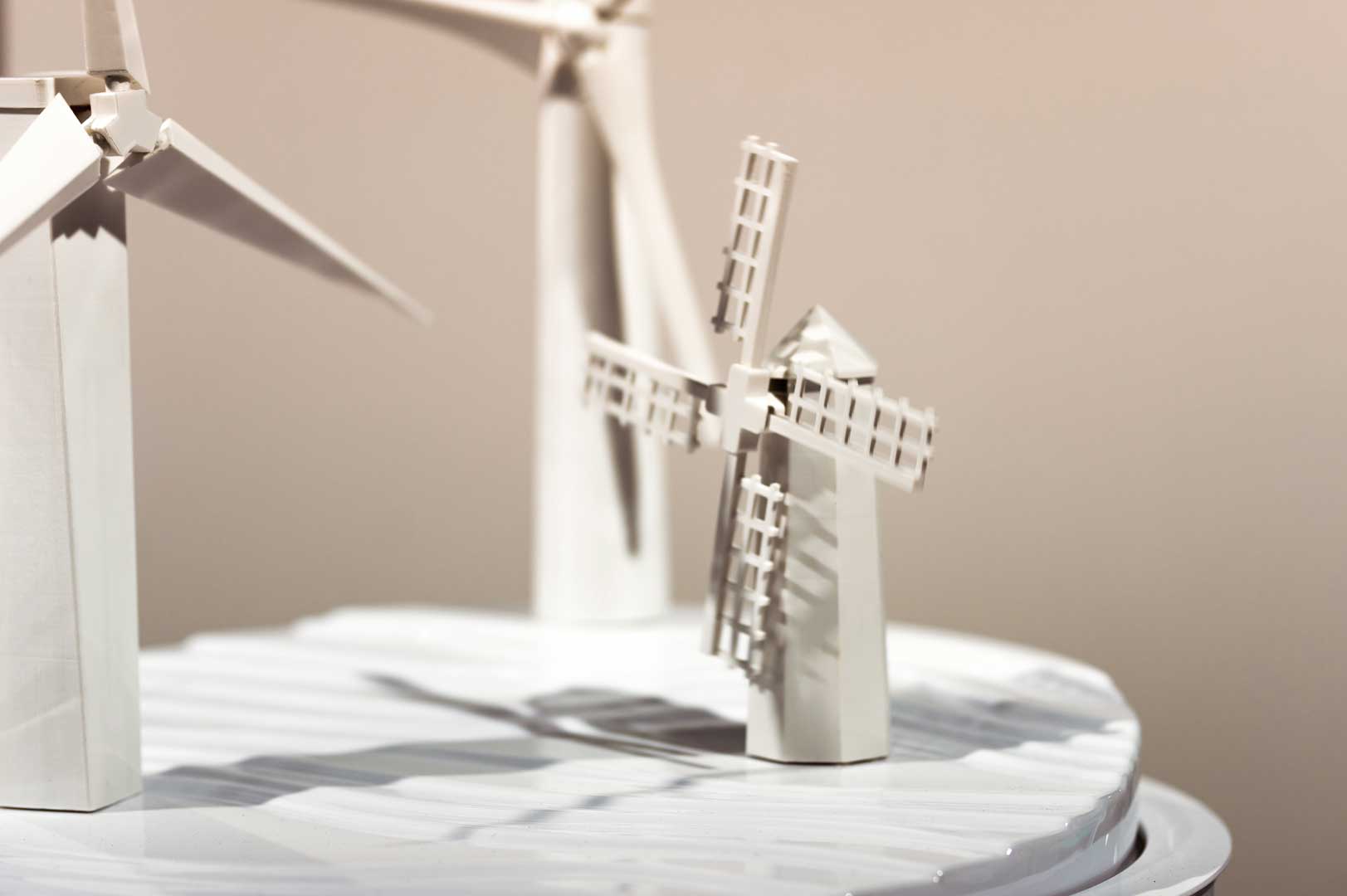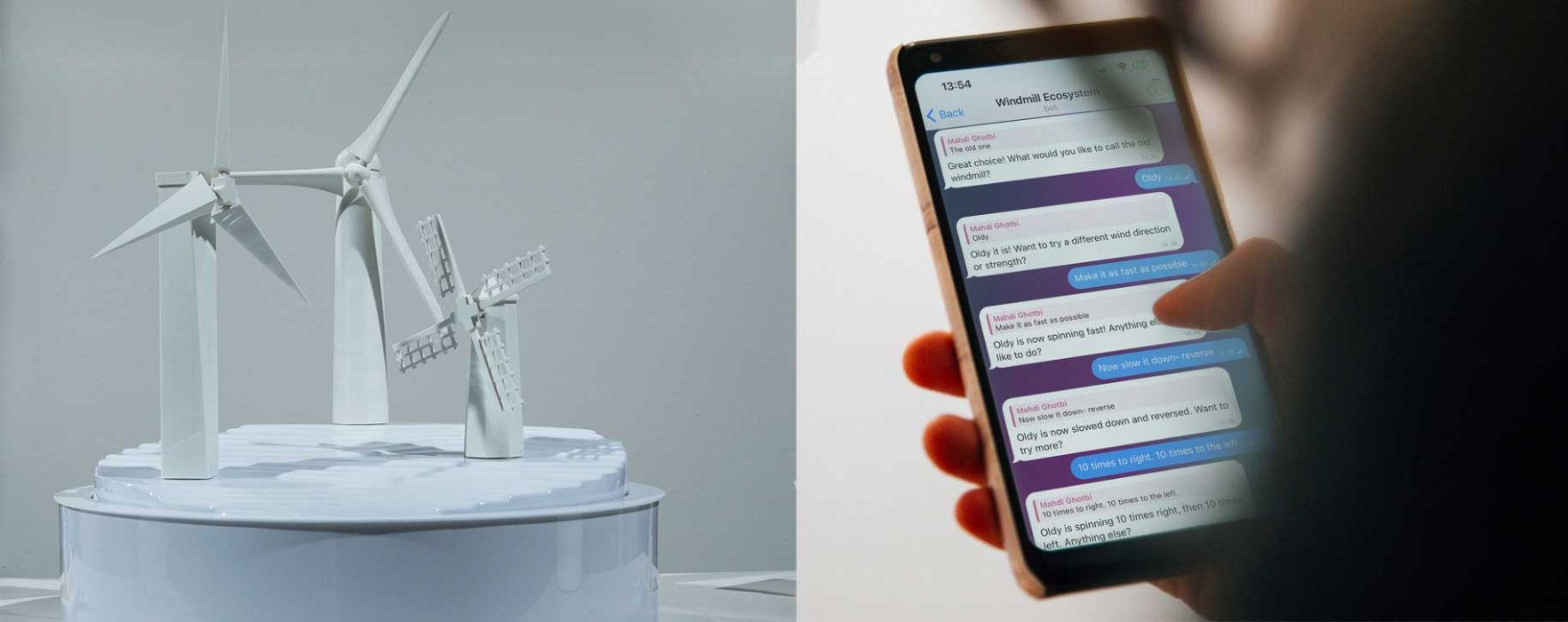 Designed as both a research probe and technical pipeline, the windmill ecosystem reveals how prompting can serve as a meta-interface for situated, embodied computation. The prototype frames the physical ensemble as a dynamic conversational field where meaning, movement, and intention are co-constructed between human, model, and machine. By linking symbolic reasoning with continuous motion, it explores how LLMs may become material collaborators—agents that translate abstract linguistic concepts into tangible, aesthetic, and spatial outcomes.