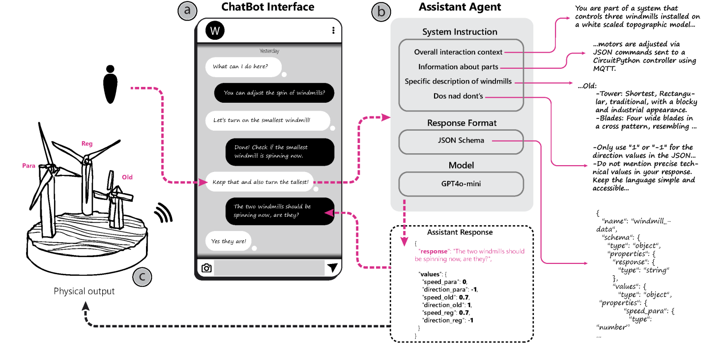 The underlying pipeline operates with a simple yet powerful approach: providing a precise description of the prototype (functionality, appearance, etc.) to the large language model. This enables the model to understand the correspondence between computer variables and the effects they can have on reality, in relation to the prototype’s functionality. There is little emphasis on specific hardware or software solutions used in the current prototypes, as the project primarily focuses on offering a new experience for users rather than introducing a new AI-powered system. However, the prototypes utilize a range of technologies, including the OpenAI Assistant API, Telegram Bot Interface, and TU Delft IDE Connected Interaction Kit, all of which can be replaced by similar alternatives.